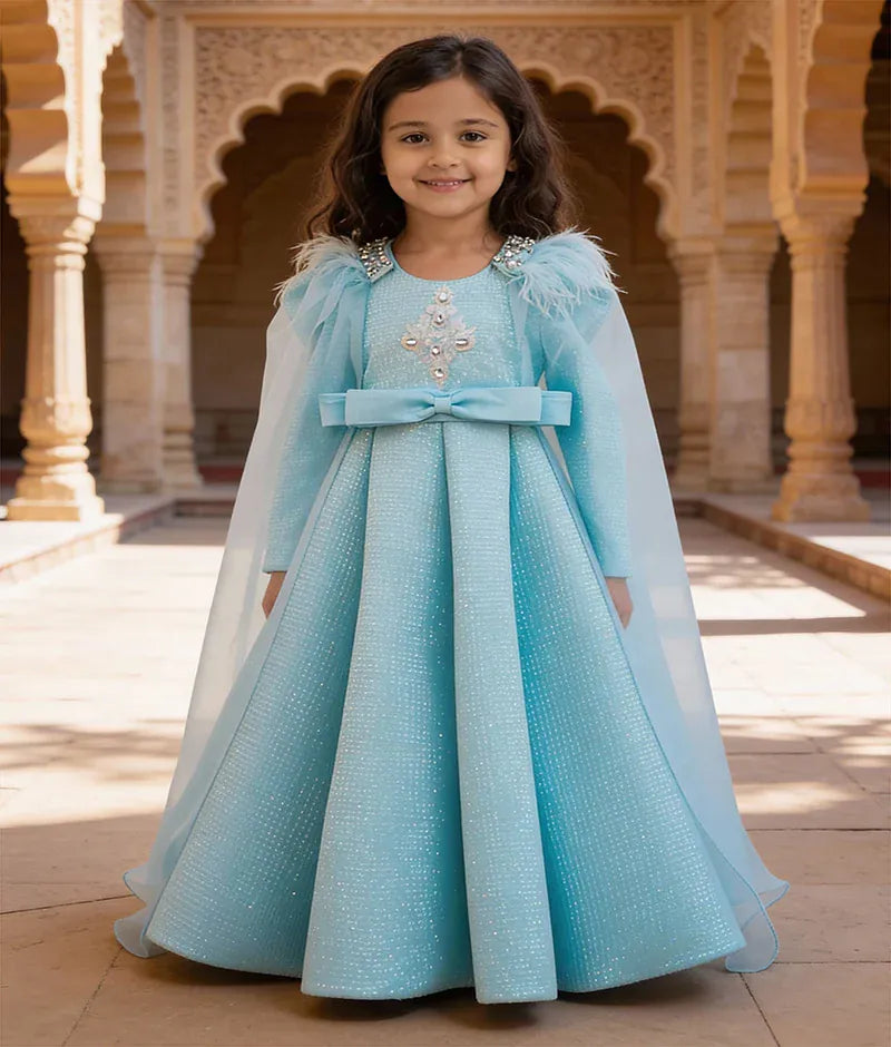Let your little princess twirl in elegance with this enchanting blue sequence gown, designed for magical moments. Featuring charming full sleeves and a round neck, this dreamy dress is adorned with intricate organza trail with Stones, Pearls & Fur, making it perfect for birthdays, celebrations, and special occasions. Finished with a zip at the back for ease and comfort, this gown is every little girl’s fairytale dream come true!