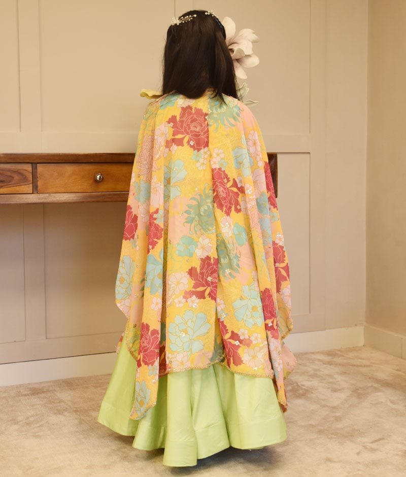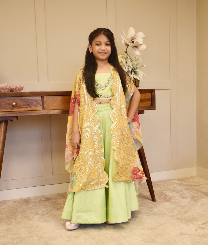 Explore our girls green crop top with pant and printed cape ensemble, featuring a comfortable cotton silk crop top with multi-colour embroidery laces for a stylish touch. The flair pants add a trendy flair, while the georgette printed embroidery cape completes the look with elegance. This lightweight ensemble is perfect for haldi or mehendi functions, allowing your little one to shine with grace and charm.