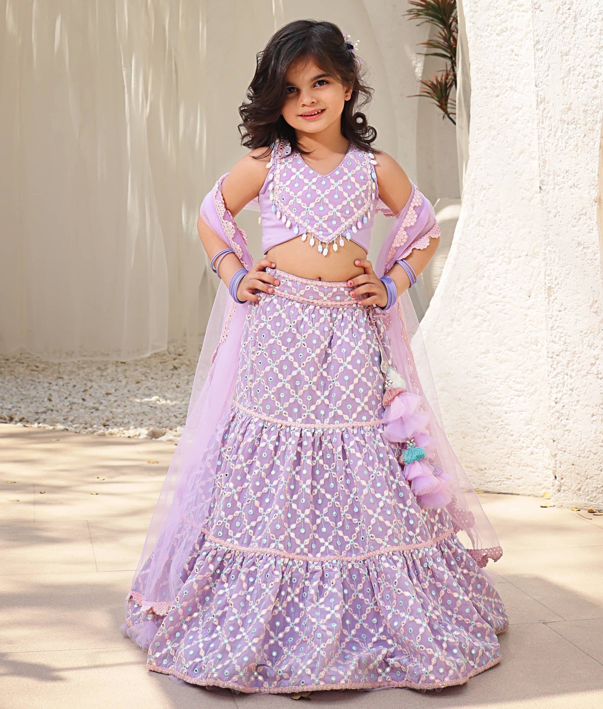 Step into a world of lilac dreams with our Embroidered Top paired with Lehenga for girls. The embroidered top, featuring a comfortable cotton lining and a back open with dori for a touch of elegance, is adorned with delicate lace finishing. Paired with an embroidered lehenga with cotton lining, net frill, and lace finishing, along with a net dupatta finished with laces and tassels, this outfit exudes charm and grace. Perfect for summery festivities or weddings, it's a fusion of lilac vibes and intricate embroidery.