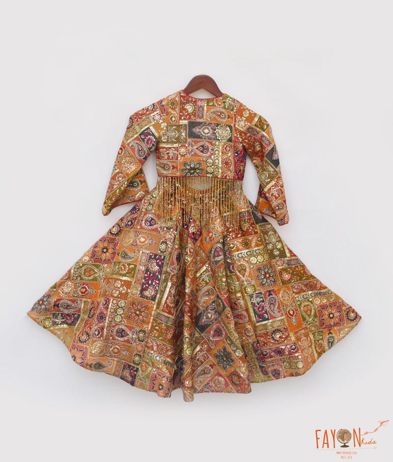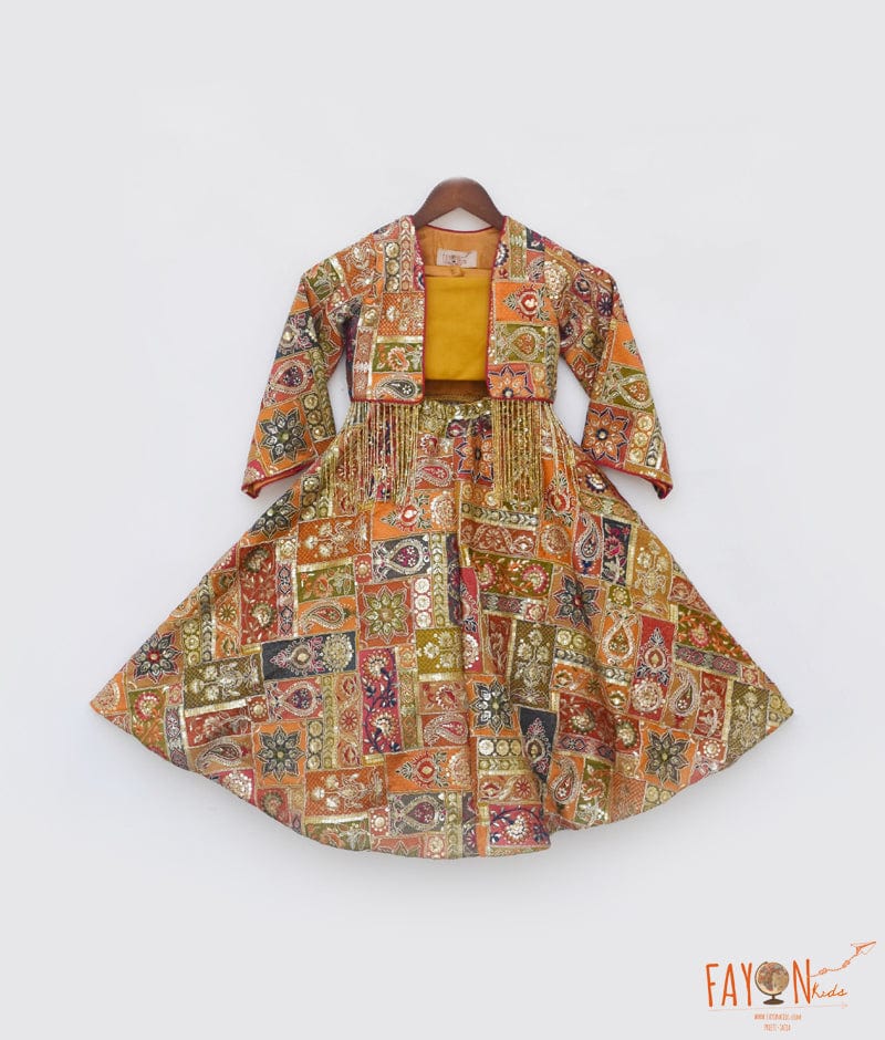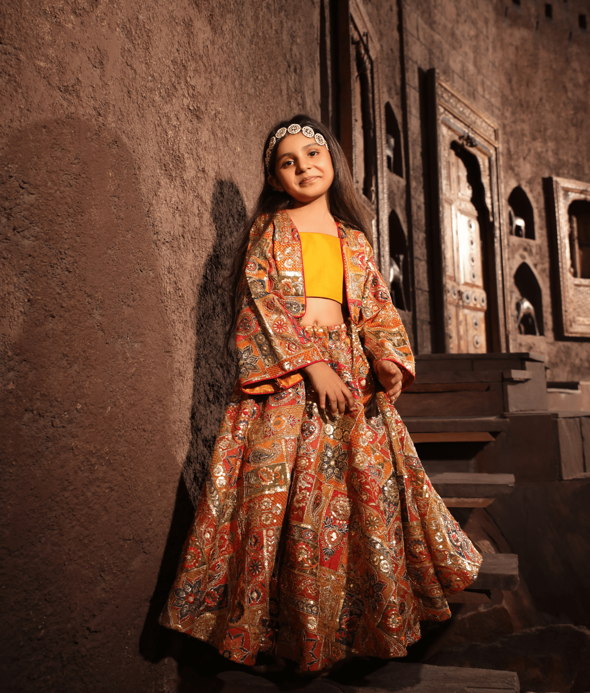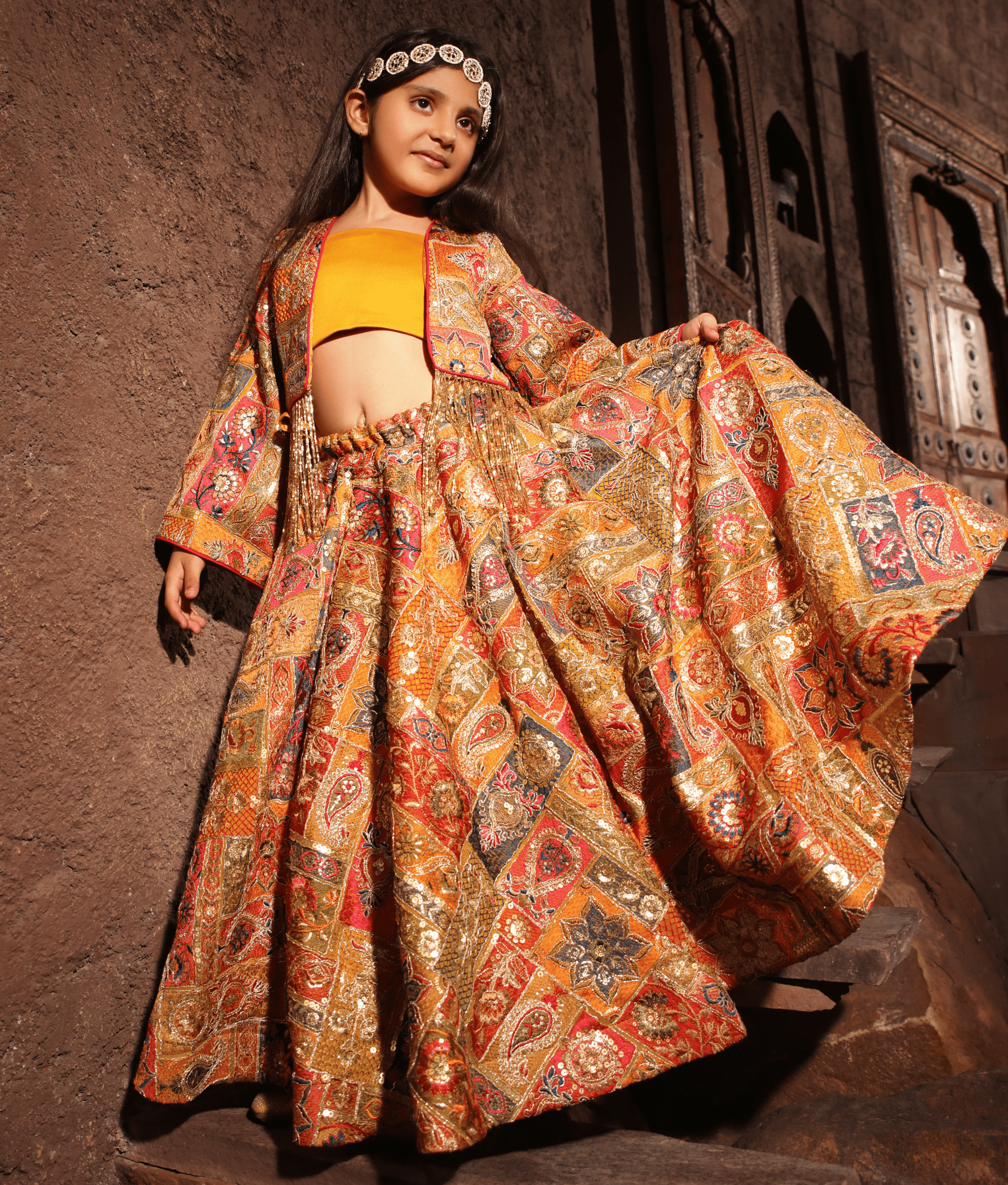 Get your kids ready to dazzle in our multi-coloured embroidered crop top skirt - the perfect winter wedding attire that keeps you stylish and warm. The beautifully crafted thread and sequence embroidery jacket with soft lining, cut dana fringe tassels detail, and the cotton silk crop top complement the thread and sequence embroidery lehenga with soft lining. Style them up with statement earrings, an alluring potli, and juttis to complete the look. This ensemble is perfect for weddings or evening soirees that you need to attend.