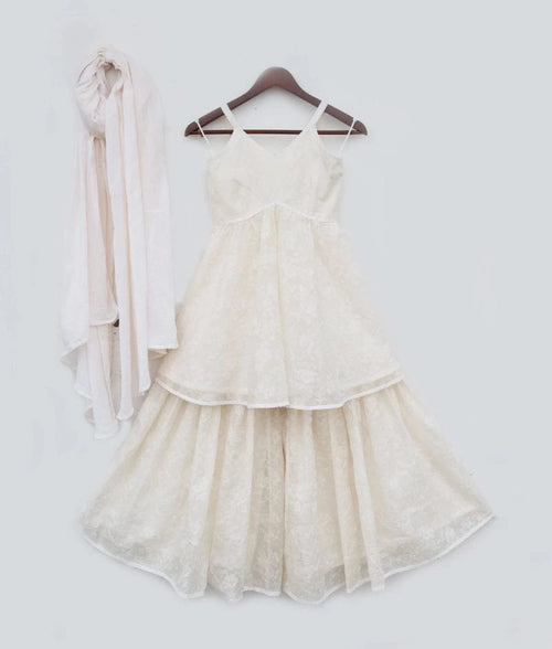 levate your ethnic wardrobe with our offwhitw Embroidered Kurti Sharara Set, featuring a stunning Embroidered Georgette Peplum Kurti with a cotton lining for comfort. The ensemble is beautifully finished with lace detailing throughout, including the cotton crinkle Dupatta which adds a touch of elegance. The Embroidery Sharara is lined with cotton for ease of wear and also boasts delicate lace finishing. Style this set with minimal jewelry and strappy heels for a sophisticated yet effortless look.