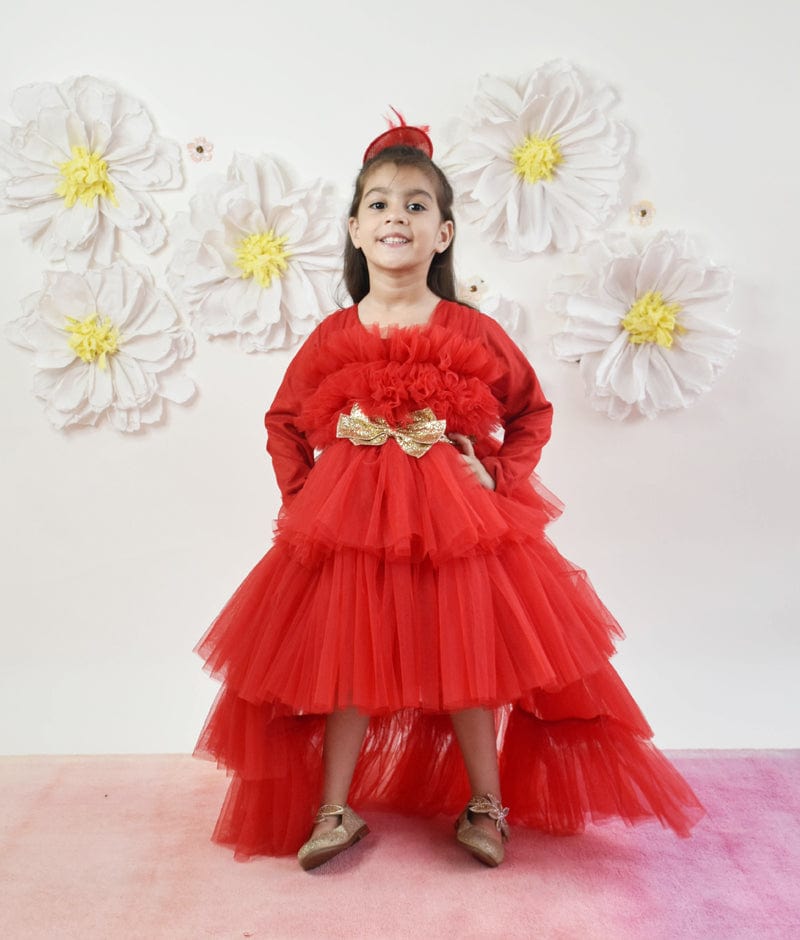 Our gorgeous high-low dress style is both distinctive and effortless to wear. This peach dress is made from net fabric. This dress gives Barbie vibes with its silhouette style featuring detachable trail, golden glitter belt and bow on waist line, full sleeves, round neck and zip at the back.