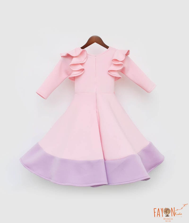 The subtlety and charm of the gorgeous dress that makes it such a perfect outfit. The pink & lilac dress features lycra fabric, frills sleeves, 3D flower motifs on waistline, round neck and zip at the back. Your child will stand boldly in grace and beauty by teaming casual footwear with this chic outfit.