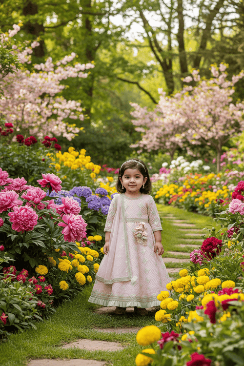 This trendy and super comfortable Pink Gota Green Net Frill Embroidery Anarkali set is sure to be her favourite pick for so many good reasons, the flared Anarkali is made of 100% cotton lining, it has full sleeves without lining and a round neck with zip at the back for ease of wear. Green net frills and pearls are finished with a detachable belt with tassels and come along with a net dupatta with silver finishing, all over the garment, has beautiful handcrafted floral motifs with gotta work.