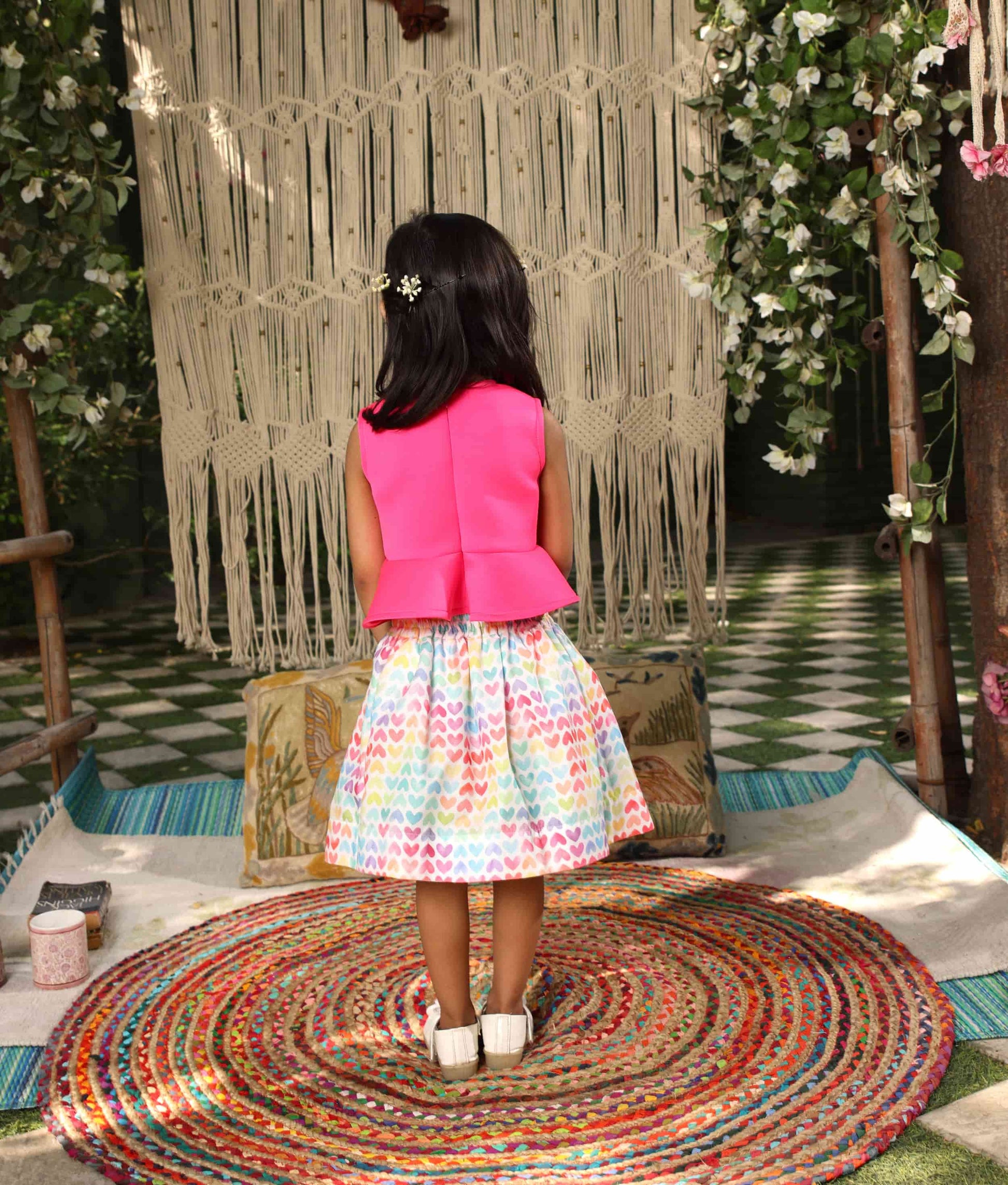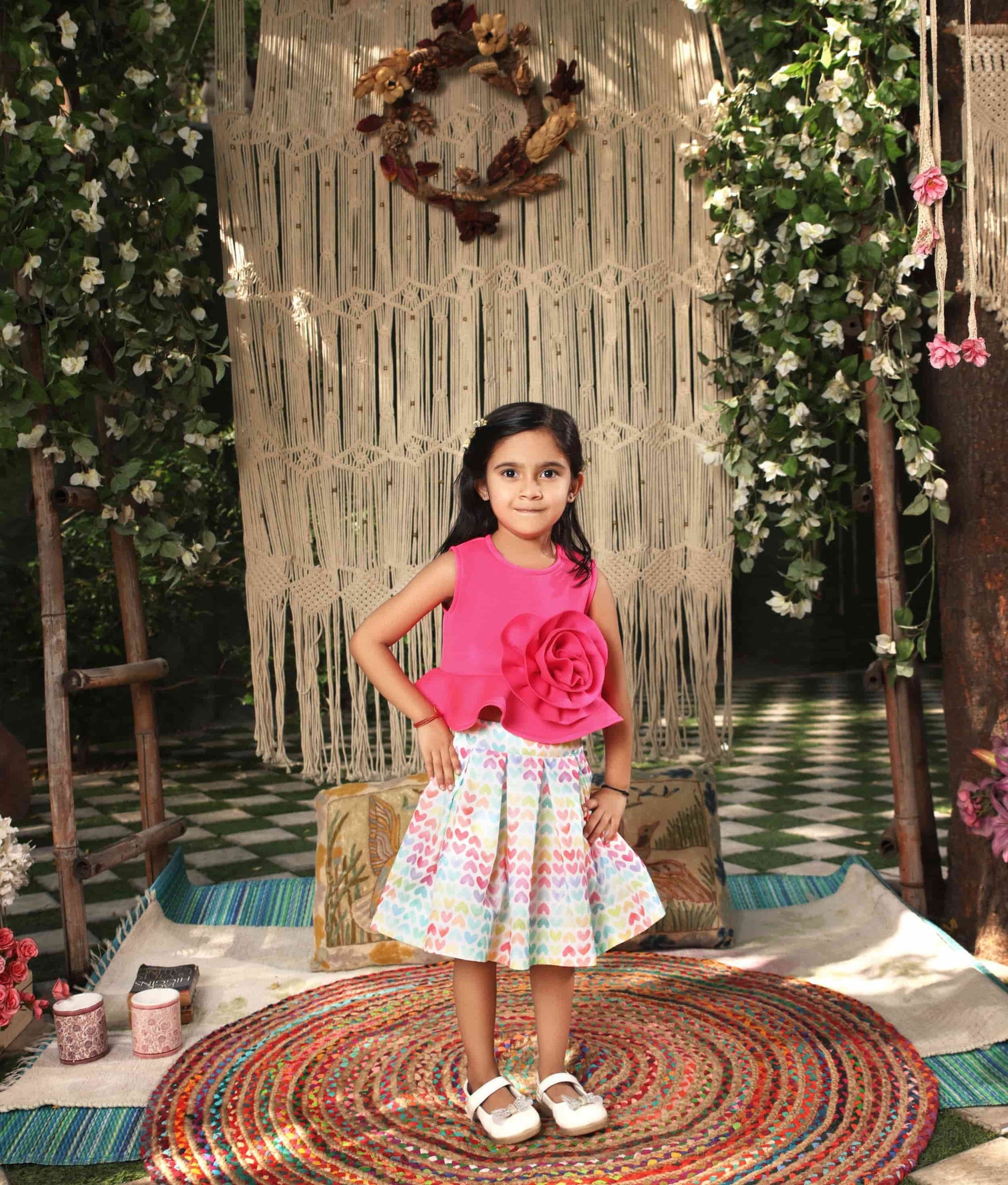 Our delightful pink lycra top with printed skirt, a perfect ensemble for your little fashionista. The pink lycra top, designed in a peplum style, adds a touch of charm and elegance to the outfit. Crafted without lining, adorned with a lovely flower on the waistline. The printed skirt features an array of vibrant patterns and comes with a soft lining for ultimate comfort. To create a whimsical touch, a cancan is attached to the skirt, giving it a fun and voluminous look. Whether it's a birthday party or a family gathering, this Pink Lycra Top with Printed Skirt is sure to make your little one shine with style and confidence.