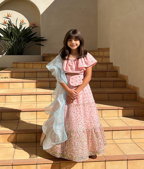 Pink Sequins Lehenga with Top Blue Organza Dupatta for Girls