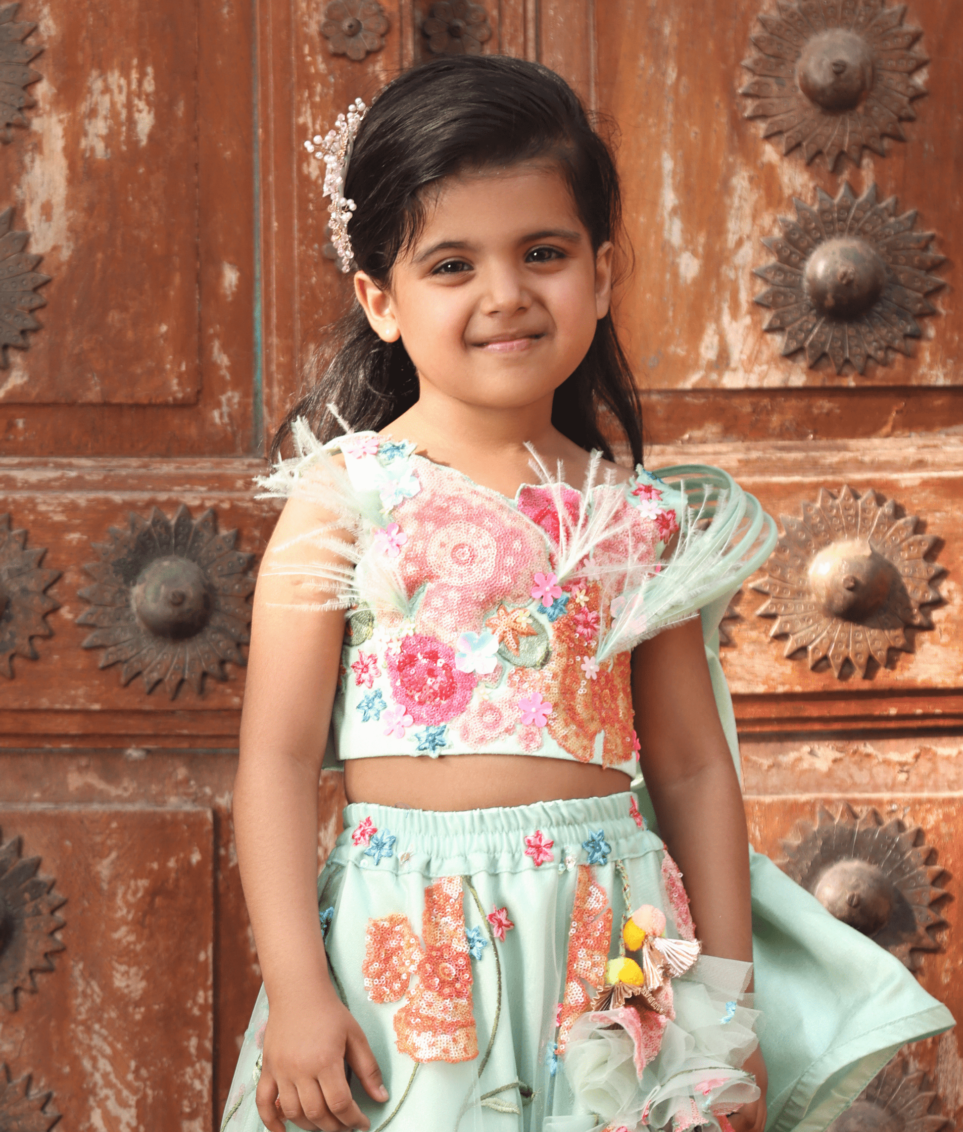 Make a stunning statement with our Green Embroidered Crop Top Skirt - featuring a 3D embroidered flower choli with fur, a sequence flower embroidered lehenga with a net frill, and an attached drape dupatta. Style it with statement earrings, bangles, and embellished footwear for an enchanting look that's perfect for the upcoming wedding season, be it a sangeet ceremony or reception.
