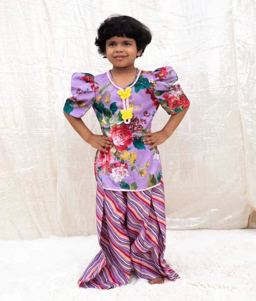 Elegance meets versatility with our Girls' Floral Printed Kurti Sharara Set. This set features a floral printed kurti with charming pompom lace finishing, paired with multi colour stripe printed sharara pants. It's the perfect attire for festive occasions like haldi ceremonies, poojas, and housewarmings, ensuring you're adorned in style for every cherished moment.