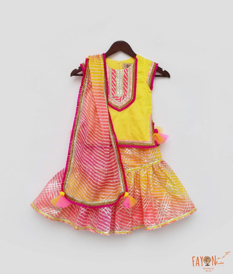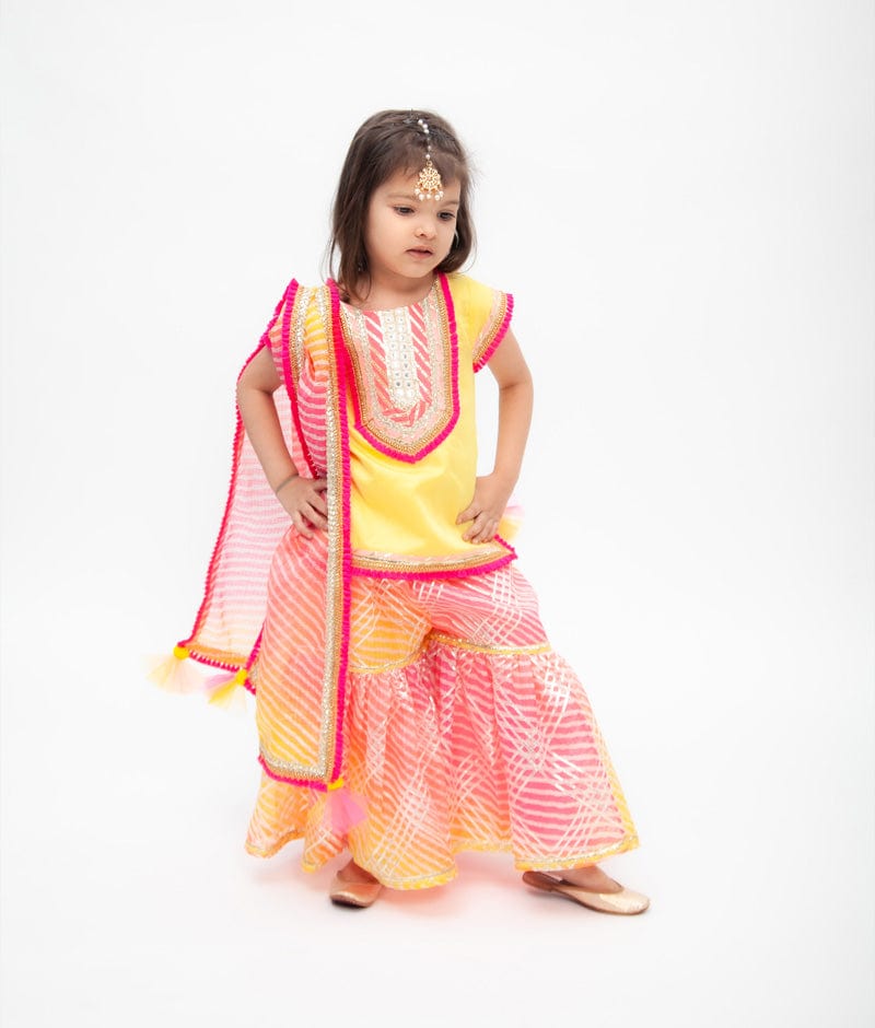 Are you still looking for something which is easy to carry for long hours for your children and is comfortable, something in ethnic wear? Here is what you need, shop this beautiful colour contrast of yellow kurta with pink printed sharara set and dupatta. It has cotton silk Kurti with cotton baselining with finishing laces on the neck and edging of kurti, tassels attached on both sides, it has cape sleeves with printed kota dupatta with tassels and finishing laces