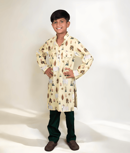 This Yellow Nandi Printed Kurta with Pant is a delightful blend of vibrant color and thoughtful design, perfect for your little oneβs wardrobe. The kurta, adorned with a bright yellow print, is crafted without lining, offering a light and breezy feel. The flap-up style pocket and lace finishing on the placket add subtle yet stylish details, while the wooden buttons enhance the traditional charm. Paired with comfortable cotton pants, this outfit is as practical as it is stylish, ideal for casual outings and festive celebrations.