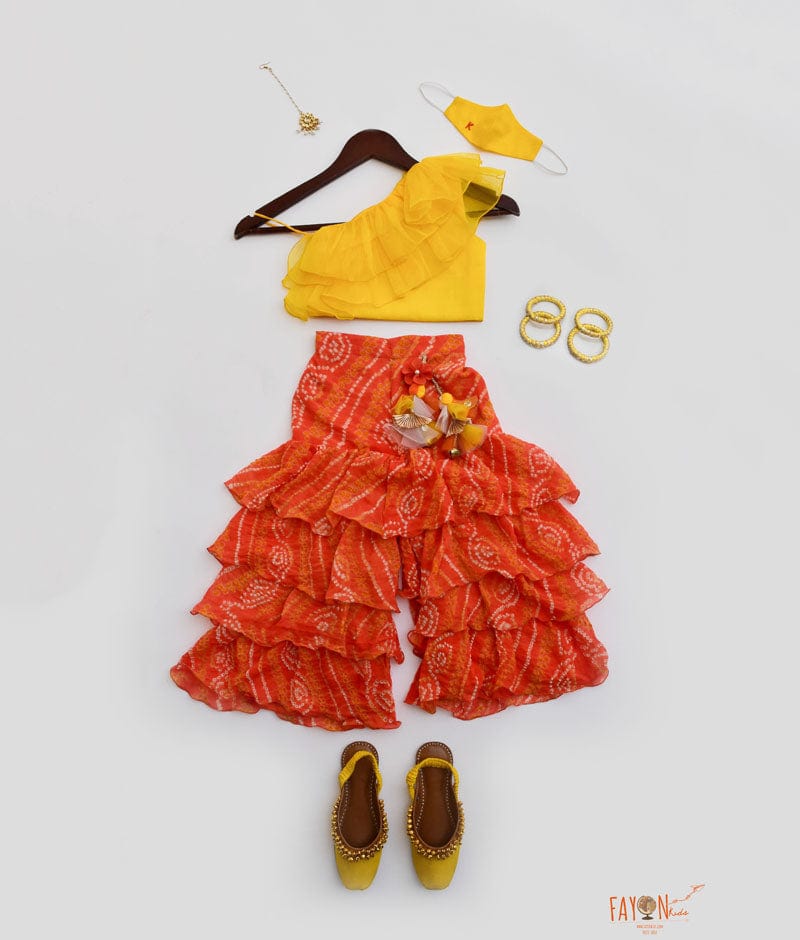 Looking for hassle-free, easygoing Indian wear for your princess? Take a look at this Sharara set with a crop top, which is designed to perfection for a stylish as well as a Comfortable look. You can accessorize this outfit with a matching face mask, Bangles, mangteeka and jutties from our couture.